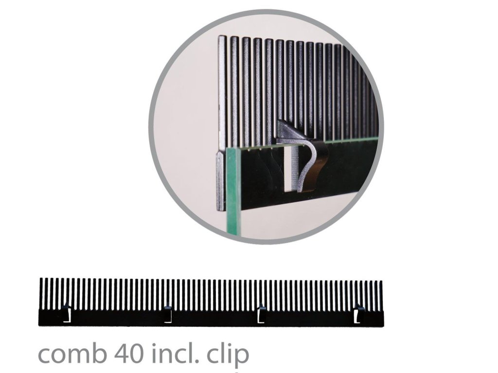 Hrebeň bez vreciek s klipmi. Hrebeň sa ľahko pripevní na okraj skla pomocou priložených klipov. Hrebeň sa dá ľahko vybrať a vyčistiť.