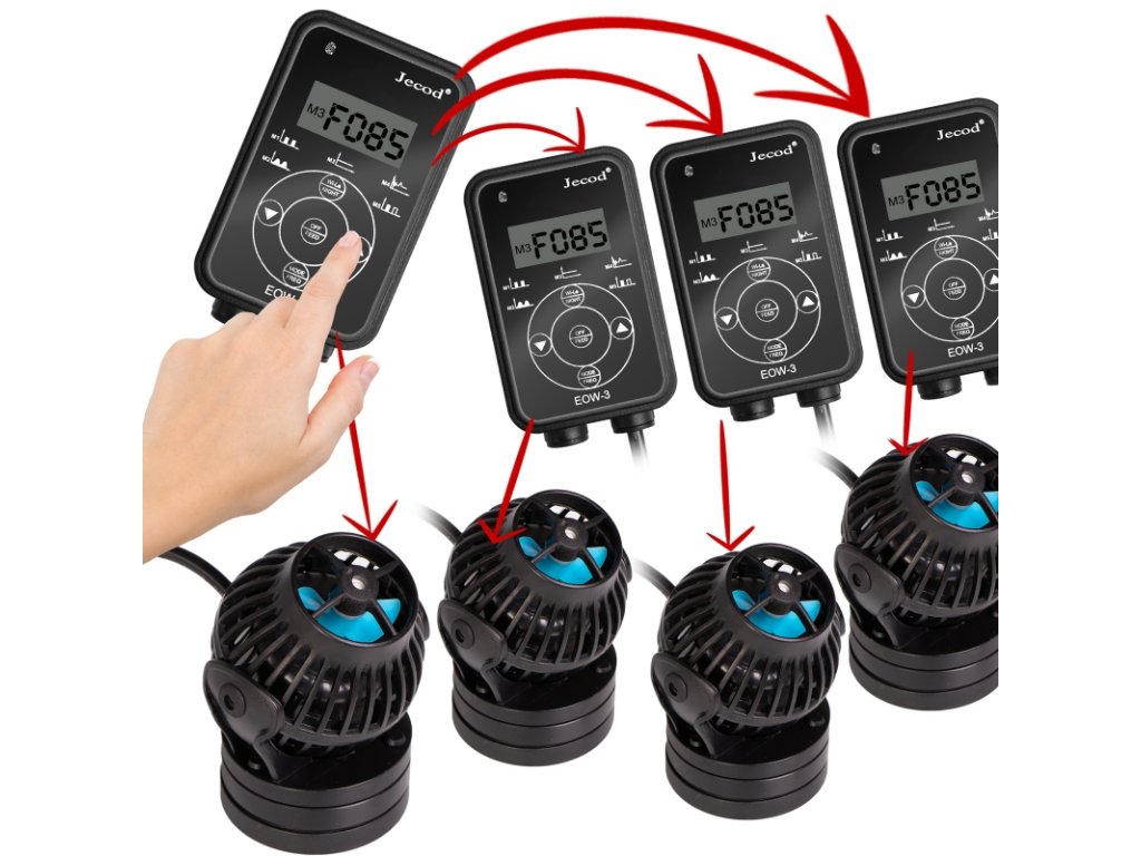 Jednou z kľúčových vlastností obehového čerpadla JECOD EOW je pokročilý ovládač, ktorý umožňuje užívateľovi plne personalizovať prácu. Vďaka piatim dostupným prevádzkovým režimom môžete chod čerpadla prispôsobiť individuálnym potrebám akvária, od jemného vlnenia až po intenzívne prúdenie. Prevádzkový výkon čerpadla je regulovaný s presnosťou na 1%, v rozsahu od 30% do 100%, čo umožňuje veľmi plynulé prispôsobenie podmienkam v nádrži. Funkcia "Feed Mode" je inovatívne riešenie pre akvaristov, ktoré umožňuje dočasne vypnúť čerpadlo na 10 minút na kŕmenie rýb, čo zabraňuje šíreniu potravy po celom akváriu. Okrem toho ponúka obehové čerpadlo možnosť upraviť vlnovú frekvenciu a výkon, čo vám umožní vytvoriť prirodzené prostredie pre obyvateľov akvária. Režim "Noc" automaticky znižuje výkon čerpadla v noci a poskytuje pokojnejšie podmienky pre ryby a ďalšie akváriové organizmy. Okrem toho sa ovládač obehového čerpadla môže bezdrôtovo pripojiť k ďalším ovládačom, čo umožňuje synchronizáciu viacerých čerpadiel a vytvorenie striedavého vlnenia.