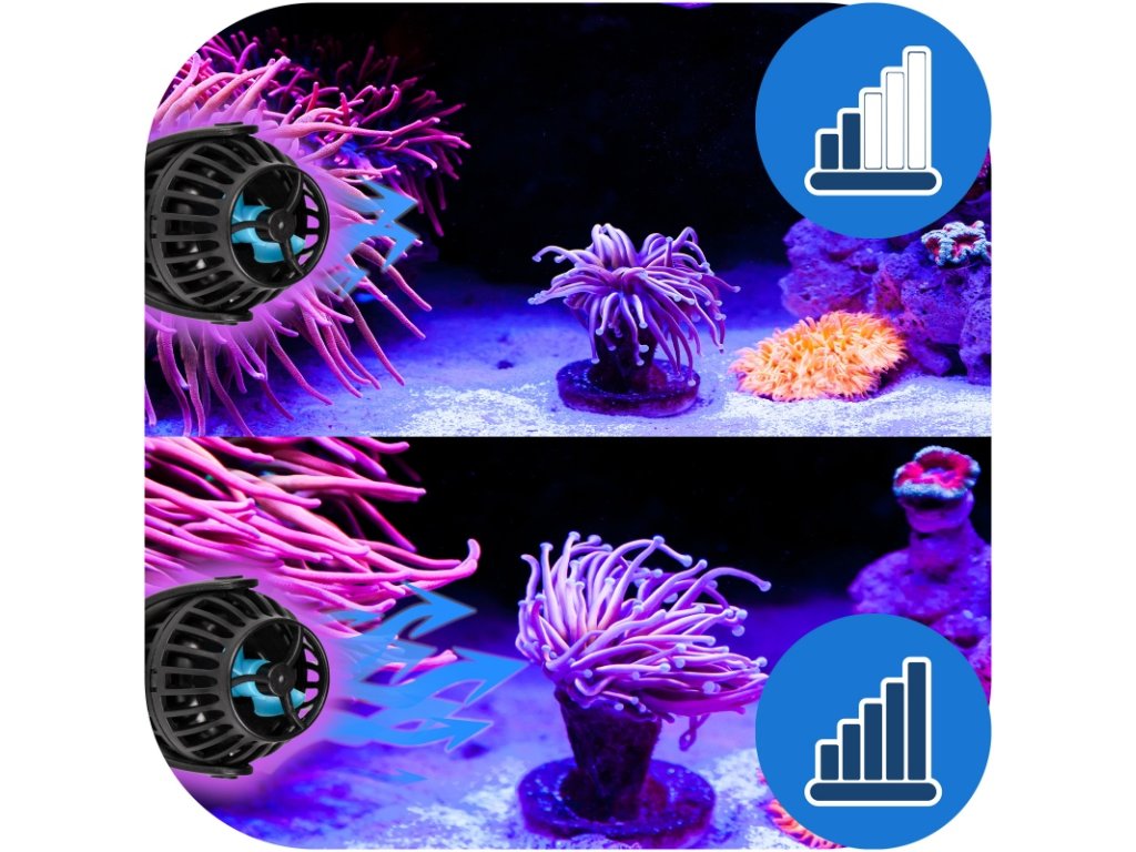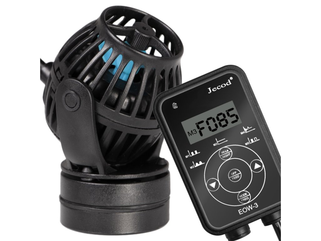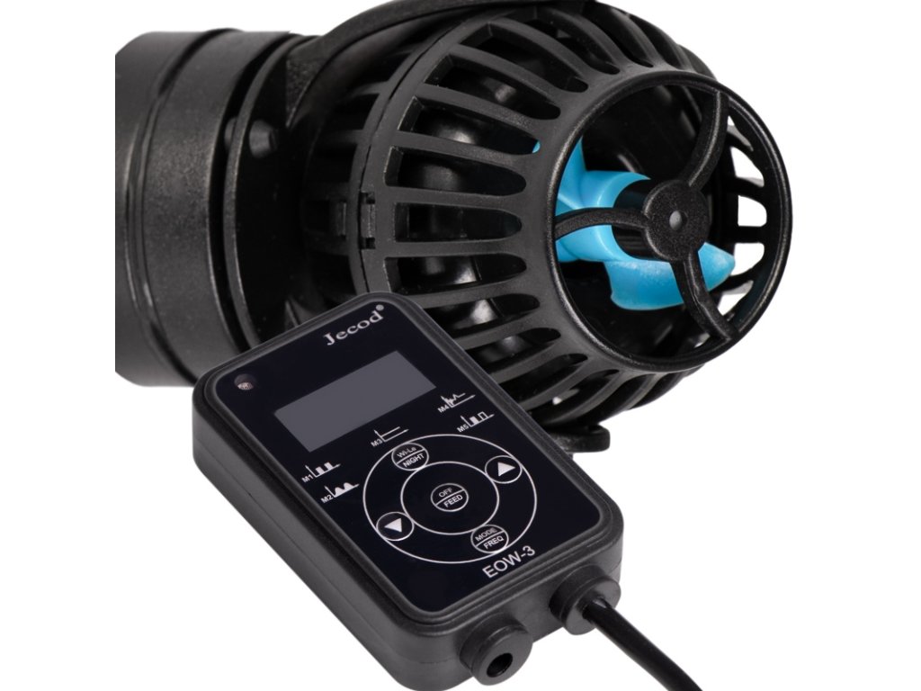 Jednou z kľúčových vlastností obehového čerpadla JECOD EOW je pokročilý ovládač, ktorý umožňuje užívateľovi plne personalizovať prácu. Vďaka piatim dostupným prevádzkovým režimom môžete chod čerpadla prispôsobiť individuálnym potrebám akvária, od jemného vlnenia až po intenzívne prúdenie. Prevádzkový výkon čerpadla je regulovaný s presnosťou na 1%, v rozsahu od 30% do 100%, čo umožňuje veľmi plynulé prispôsobenie podmienkam v nádrži. Funkcia "Feed Mode" je inovatívne riešenie pre akvaristov, ktoré umožňuje dočasne vypnúť čerpadlo na 10 minút na kŕmenie rýb, čo zabraňuje šíreniu potravy po celom akváriu. Okrem toho ponúka obehové čerpadlo možnosť upraviť vlnovú frekvenciu a výkon, čo vám umožní vytvoriť prirodzené prostredie pre obyvateľov akvária. Režim "Noc" automaticky znižuje výkon čerpadla v noci a poskytuje pokojnejšie podmienky pre ryby a ďalšie akváriové organizmy. Okrem toho sa ovládač obehového čerpadla môže bezdrôtovo pripojiť k ďalším ovládačom, čo umožňuje synchronizáciu viacerých čerpadiel a vytvorenie striedavého vlnenia.