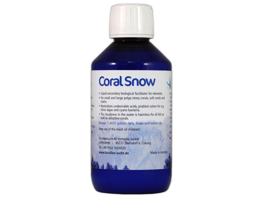 Tento tekutý biologický prípravok uľahčuje vstrebávanie stopových prvkov, ako je Pohl's B-Balance Concentrate a Draiumjodid Fluor Concentrate. Môže sa bez problémov dávkovať s akýmkoľvek iným prípravkom, ako je Pohl's Coral Vitalizer alebo Amino Acid High Concentrate. Obsahujú prírodné ióny vápnika, horčíka a uhličitanu, ktoré koraly dokážu priamo absorbovať. Coral Snow neutralizuje neabsorbované aminokyseliny a ďalšie zlúčeniny a je tiež veľmi nápomocný v boji napríklad proti slizkým riasam alebo siniciam. Odporúča sa zmiešať Coral Snow v samostatnej nádobe s iným prvkom podľa vášho výberu.