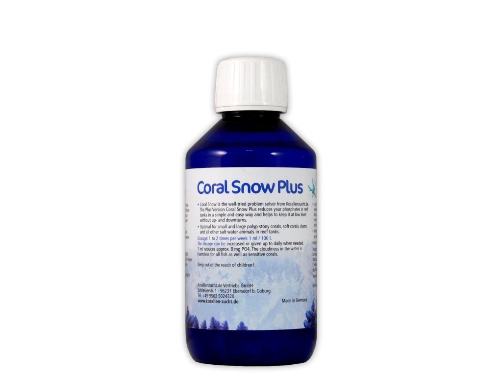 Tento tekutý biologický prípravok uľahčuje vstrebávanie stopových prvkov, ako je Pohl's B-Balance Concentrate a Draiumjodid Fluor Concentrate. Môže sa bez problémov dávkovať s akýmkoľvek iným prípravkom, ako je Pohl's Coral Vitalizer alebo Amino Acid High Concentrate. Obsahujú prírodné ióny vápnika, horčíka a uhličitanu, ktoré koraly dokážu priamo absorbovať. Coral Snow neutralizuje neabsorbované aminokyseliny a ďalšie zlúčeniny a je tiež veľmi nápomocný v boji napríklad proti slizkým riasam alebo siniciam. Odporúča sa zmiešať Coral Snow v samostatnej nádobe s iným prvkom podľa vášho výberu. Teraz vo verzii Plus navyše odstraňuje z vody fosfáty.