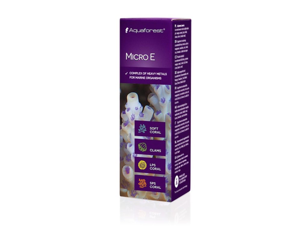 Doplnok obsahuje koncentrované ťažké kovy, ako je mangán, vanád, zinok, nikel, železo, chróm, kobalt a meď. Stopové prvky sa v morskej vode vyskytujú vo veľmi malých množstvách, ale sú kľúčové pre chov koralov. MicroE umožňuje dávkovanie ťažkých kovov v správnom pomere. Tieto stopové prvky zabezpečia, že koraly budú mať krásne, sýte farby a budú vo výbornom stave. Pri použití výkonných odpeňovačov bielkovín, ktoré počas prevádzky odstraňujú ťažké kovy, zabezpečte pravidelné dopĺňanie.
