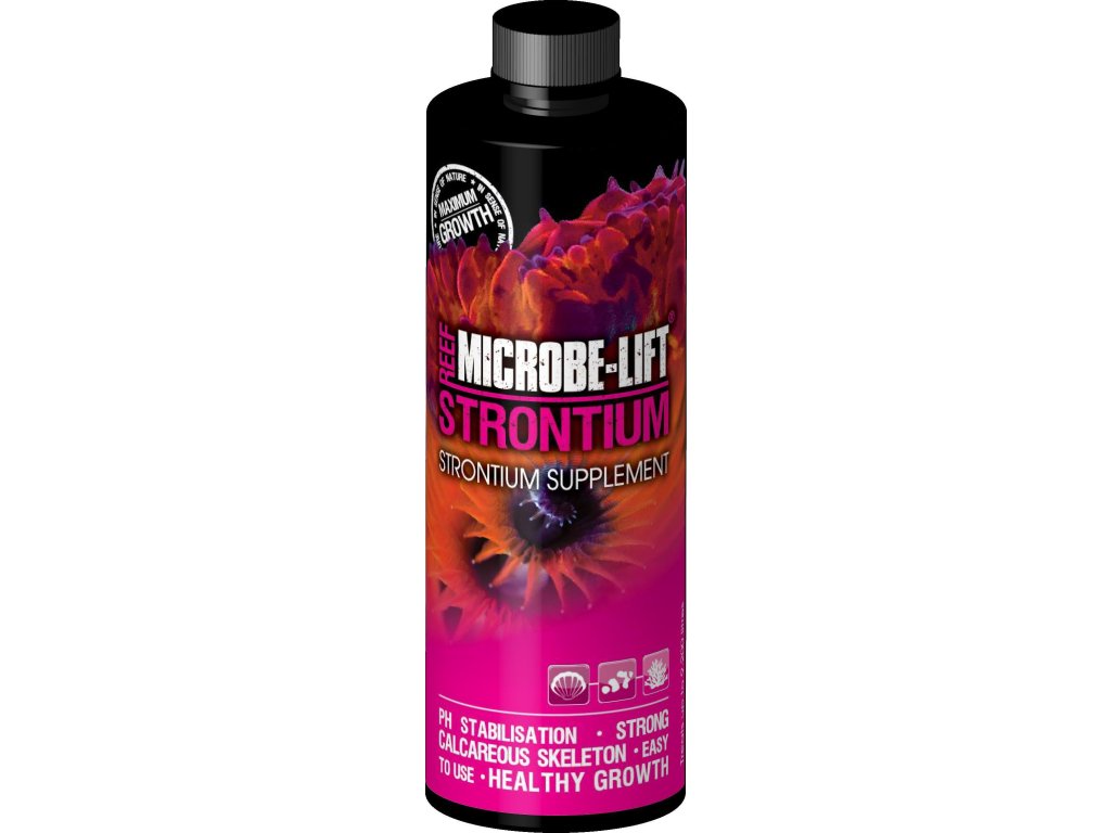 Microbe-lift Stroncium – zdroj stroncia pre morské akváriá. Špeciálna receptúra stroncia so stabilizátorom pH. Zabraňuje nedostatku stroncia, podporuje zdravý rast vápenatej kostry organizmov a posilňuje ich mäkké tkanivá.