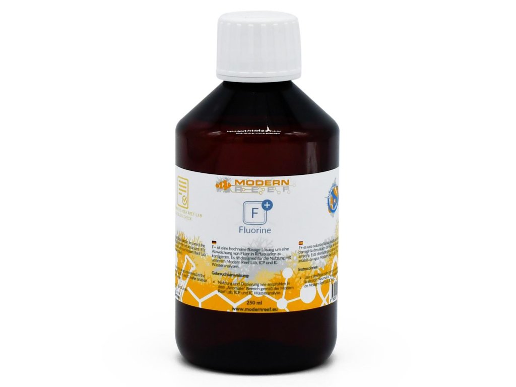 F+ je vysoko čistý tekutý roztok na úpravu nerovnováhy fluoridov v útesových akváriách. 5 ml Modern Reef F+ zvyšuje hladinu fluoridov v 100 litroch (27 US gal) o 0,1 mg/l.
